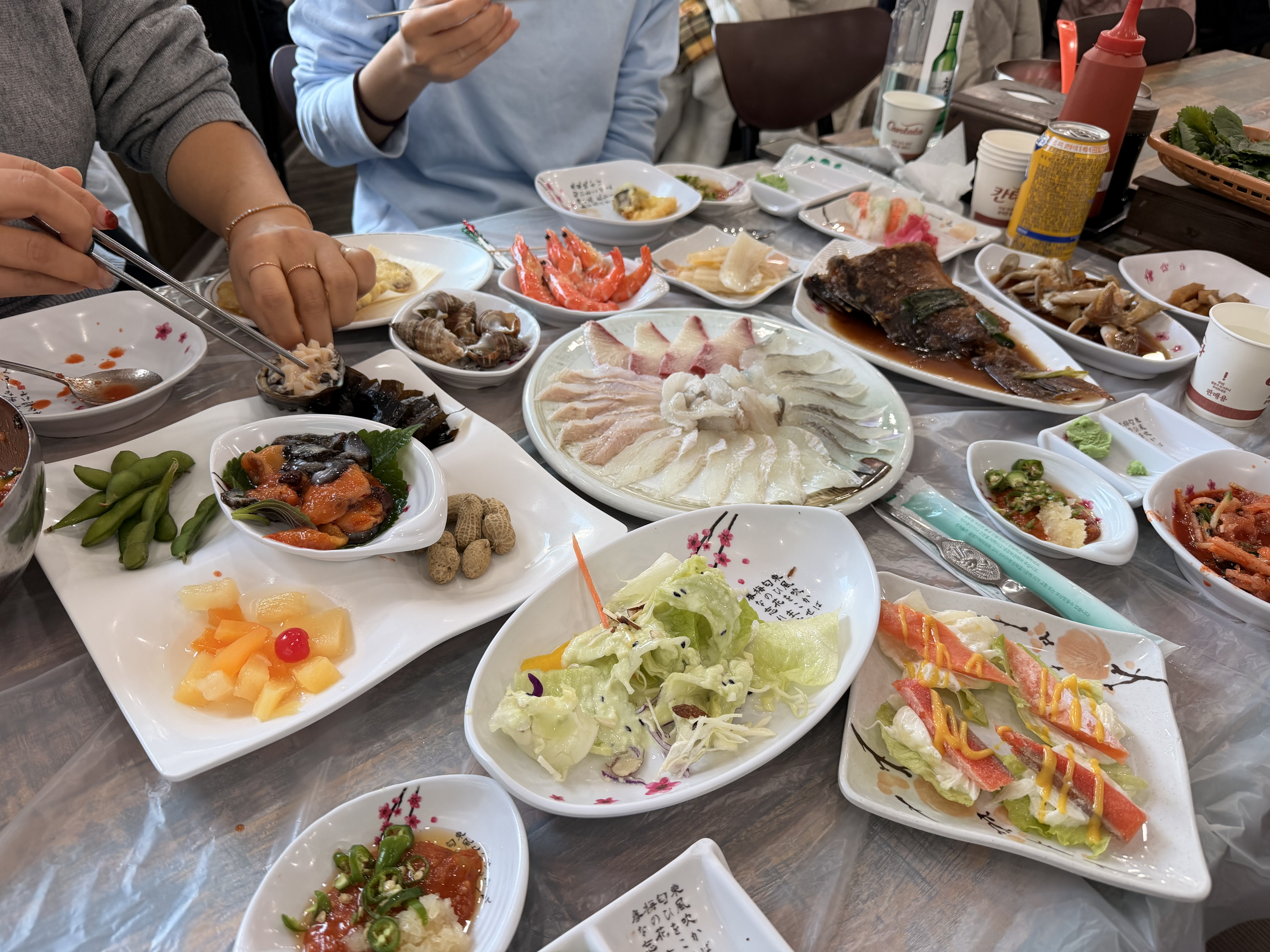 물회, 미역, 샐러드, 튀김, 초밥, 멍게, 해삼, 새우, 소라, 게장 등등 다양한 밑반찬이 명수 기준으로 나온다.